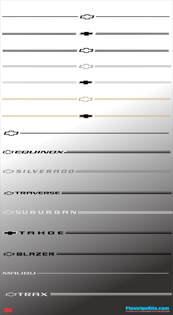 These pinstripe / pinstriping vinyl decals, stickers, logo , emblem and graphics can make your Chev Chevy Chevrolet Equinox, Tahoe, Traverse, Silverado, Colorado, Suburban, Trax, Malibu, Impala, and Cruze - truck , car, or suv vehicle - look more appealing.