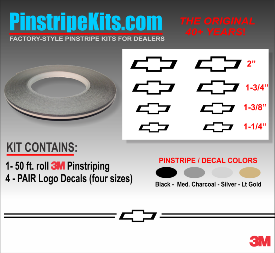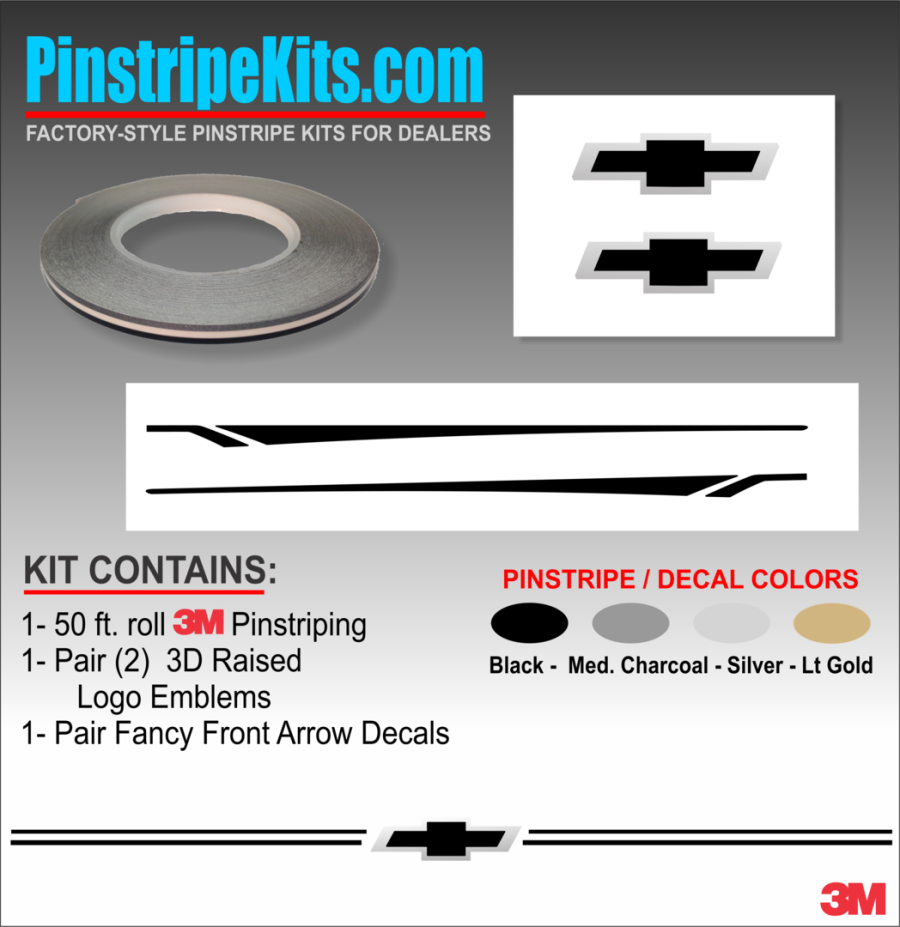 These Chev Chevy Chevrolet Equinox, Tahoe, Traverse, Silverado, Colorado, Suburban, Trax, Malibu, Impala, and Cruze logo emblem graphic truck, car, vehicle, or suv - vinyl logo bowtie graphic decal stripe / pin-striping sticker kits can help sell your vehicles more quickly - by making them more visually appealing and attractive, through the modest highlighting provided through the use of timeless pin-striping / pin striping of car, vehicle, and truck vinyl graphics and decals.