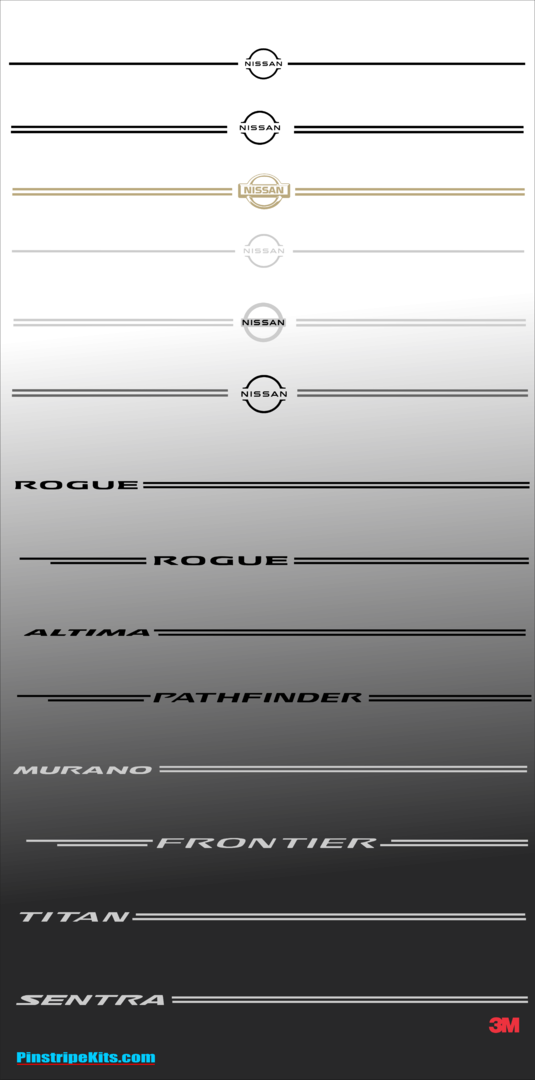 These pinstripe / pinstriping vinyl decals, stickers, logo , emblem and graphics can make your Nissan Rogue, Nissan Murano, Nissan Pathfinder, Nissan Frontier, Nissan Titan, Nissan Altima, Nissan Maxima, Nissan Armada, Nissan Kicks, Nissan Juke, Nissan Sentra, Nissan Versa, and Nissan Quest - truck, car, or suv vehicle - look more appealing.