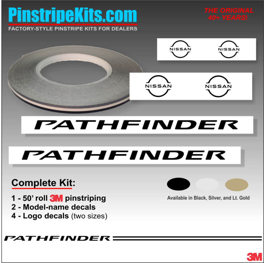 Nissan Altima Maxima Versa Xterra Pathfinder Titan versa Frontier Rogue Pathfinder Murano vinyl pinstripe emblem stripe logo decal graphic Nissan Pathfinder Vinyl Stripe - 3M Pinstripe Kit with Logo Emblem Decals