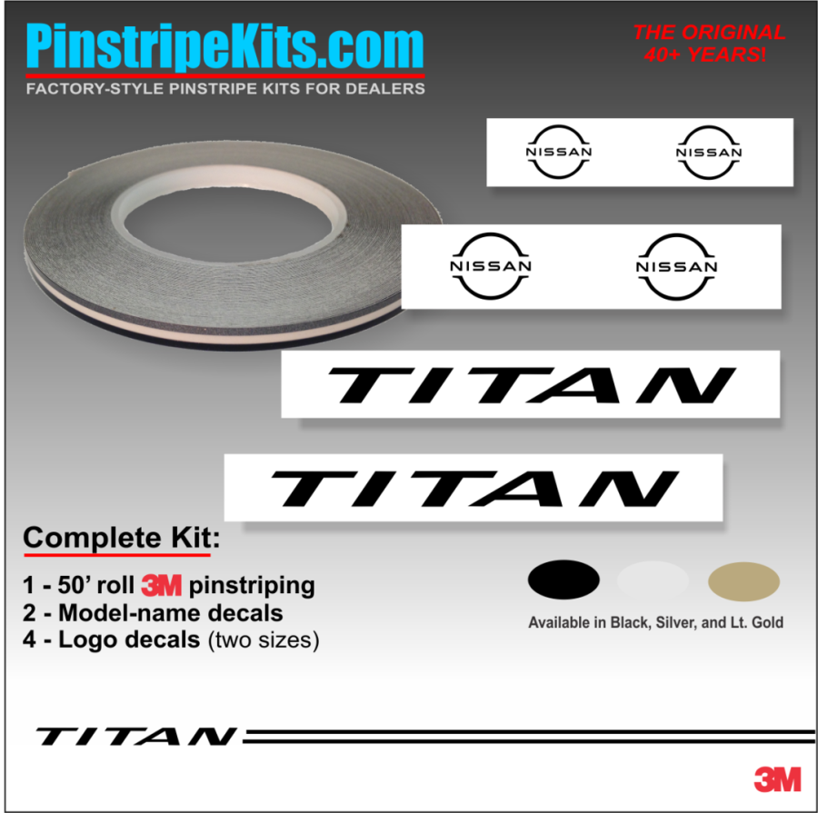 Nissan Altima Maxima Versa Xterra Pathfinder Titan versa Frontier Rogue Pathfinder Murano vinyl pinstripe emblem stripe logo decal graphic Nissan Titan Vinyl Stripe - 3M Pinstripe Kit with Logo Emblem Decals