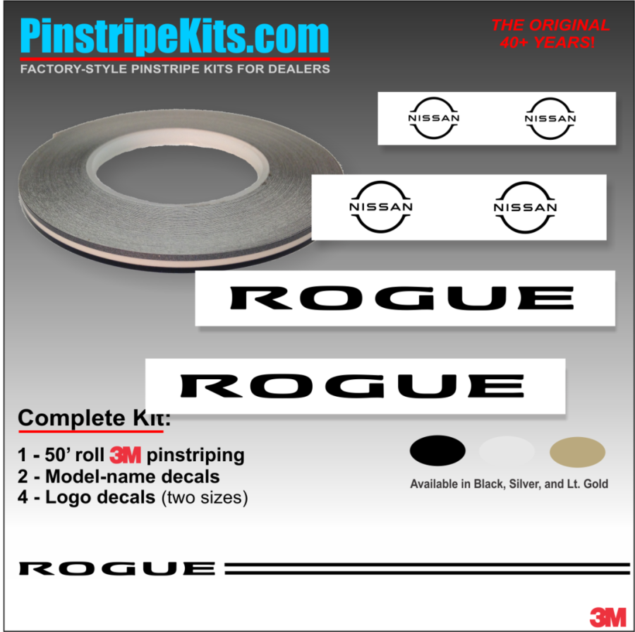 Nissan Altima Maxima Versa Xterra Pathfinder Titan versa Frontier Rogue Pathfinder Murano vinyl pinstripe emblem stripe logo decal graphic Nissan Rogue Vinyl Stripe - 3M Pinstripe Kit with Logo Emblem Decals