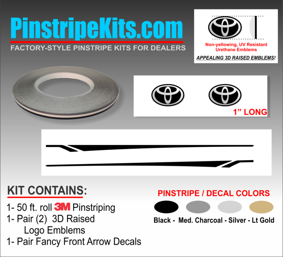 These Toyota Rav4, Toyota Highlander, Toyota 4Runner, Toyota Tundra, Toyota Tacoma, Toyota Camry, Toyota Corolla, Toyota Sienna, Toyota Sequoia, Toyota Avalon, and Toyota Prius logo emblem graphic truck, car, vehicle, or suv - vinyl logo graphic decal stripe / pin-striping kits can help sell your vehicles more quickly - by making them more visually appealing and attractive, through the modest highlighting provided through the use of timeless pin-striping / pin striping of car, vehicle, and truck vinyl graphics and decals.